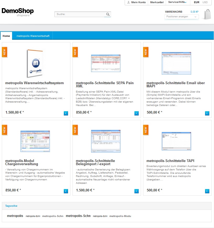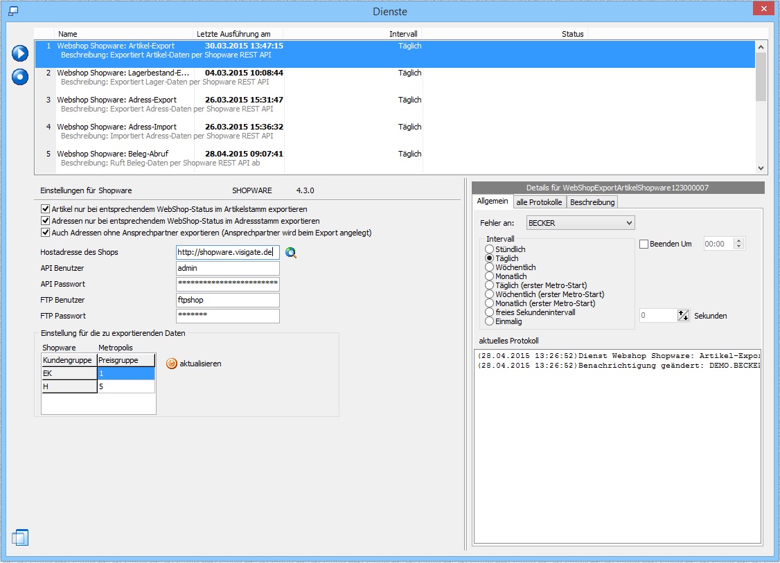 - Die Shopware-Schnittstellle stellt ein Verbindung von metropolis zu Shopware und von Shopware zu metropolis her. Über den metropolis-Dienstmanager können Adressen, Artikel und Lagerbestände exportiert und Adressen importiert und Belege abgerufen werden.